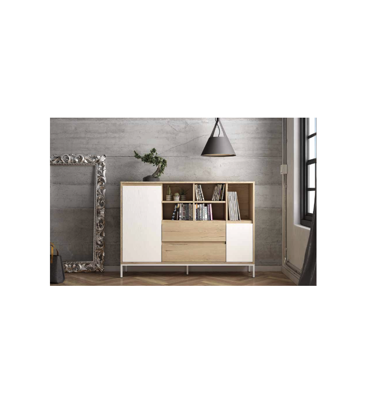 Combinación de módulos abiertos y cerrados: dos puertas, tres amplios cajones y huecos abiertos para libros, objetos decorativos o vajilla.