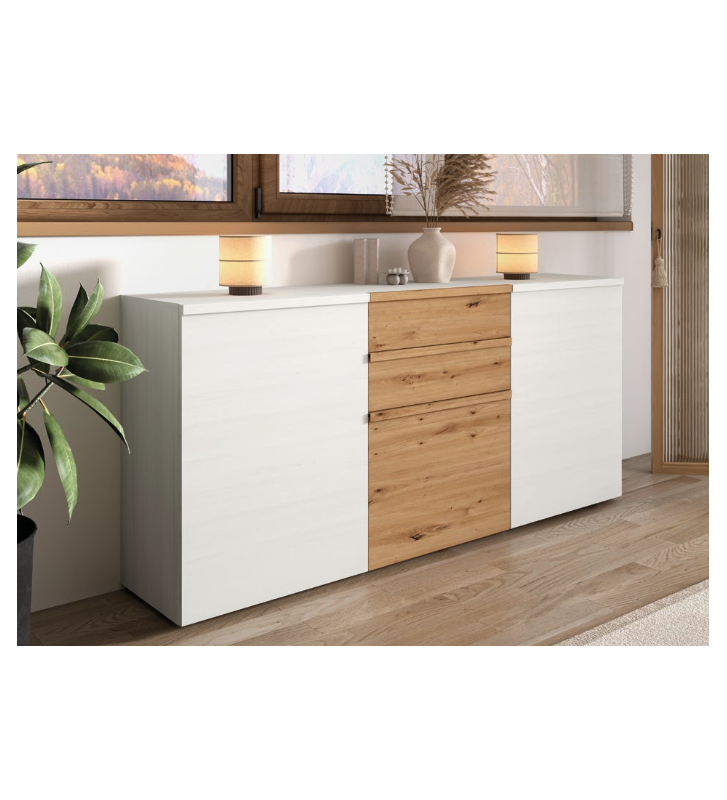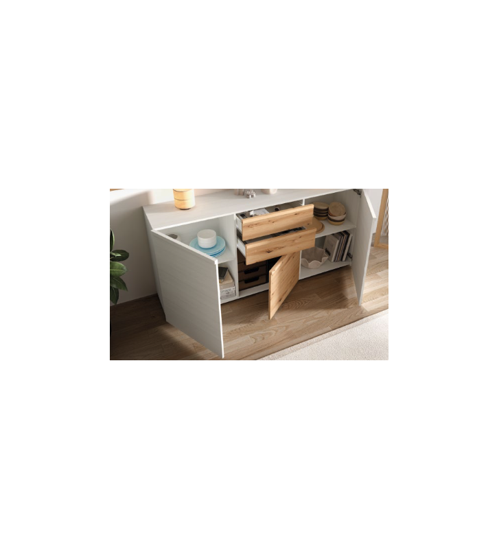 Este aparador es la fusión perfecta entre estilo y funcionalidad. Con una estructura limpia y minimalista en blanco artik y un frente central en roble noddy, aporta calidez y sofisticación a cualquier estancia.