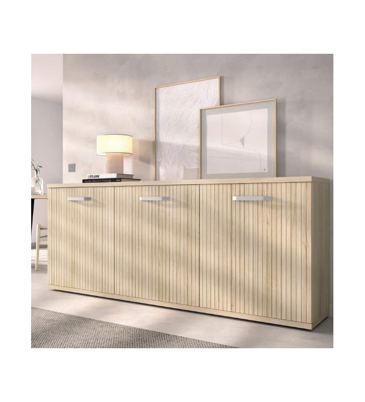 Aparador de 4 puertas con diseño acanalado en madera clara. Elegancia contemporánea con mucho almacenaje.
