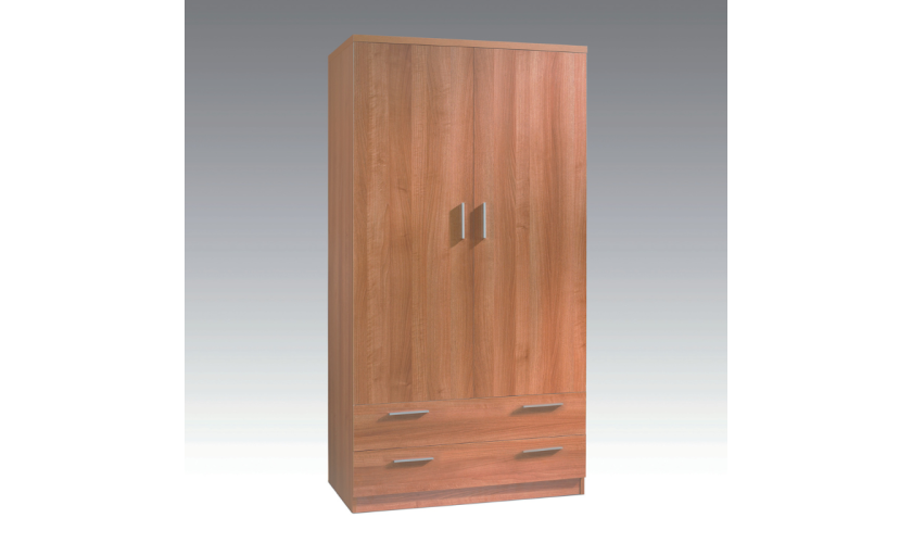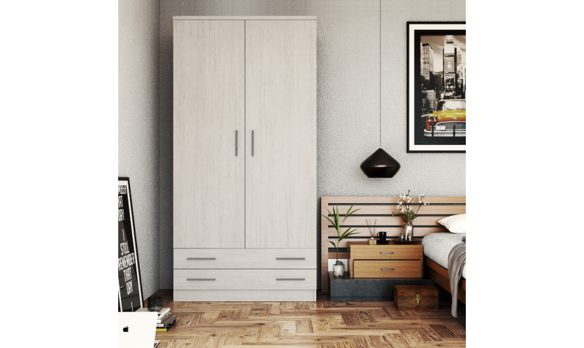 Armario de dos puertas en madera color nude con acabados en gris roca