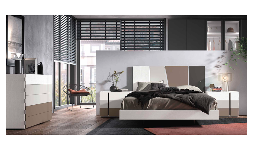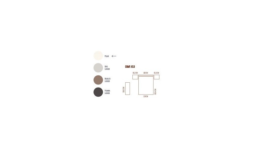 Cabezal Wanda 160x115, bancada volada recta base 150x190, mesita 3 cajones derecha 65.3 vertical, mesita 3 cajones izquierda 65.3 vertical, comodín 5 cajones derecho 100.3.