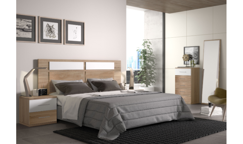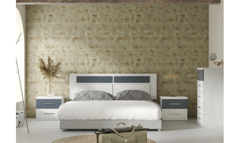Dormitorio de matrimonio con distintas combinaciones de colores y maderas para la comoda y el cabecero