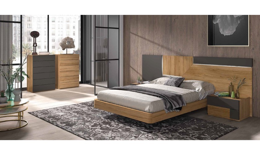 Dormitorio completo compuesto de cabecero, canapé, dos mesitas y cómoda en madera oscura legend y gris lacado