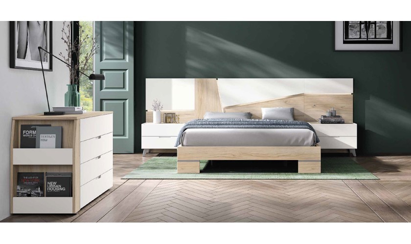Dormitorio completo compuesto de cabecero, canapé, dos mesitas y cómoda en madera blanca y con acabados en madera habana