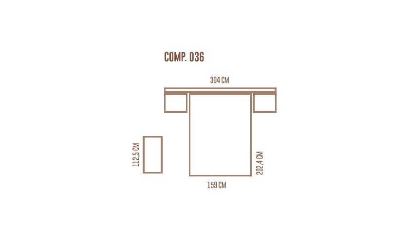 Cabezal Skorpio 304x115 (72+160+72), bancada curva 150x190, 2 mesitas 2 cajones 65.3 Sare costados y frentes lacados, comodín extraíble izq. tirador Sare frente cajones lacados.