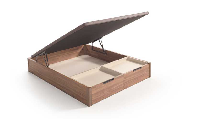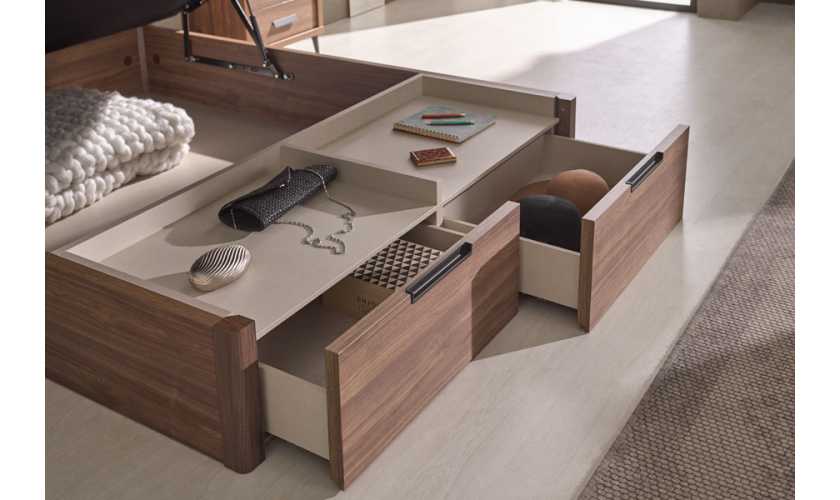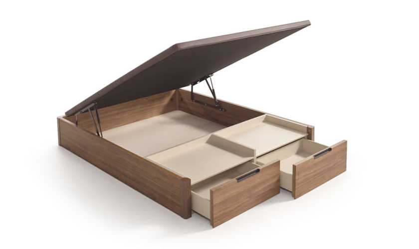 Te presentamos el canapé abatible de madera Draw con contorno, este está diseñado para una perfecta organización de su almacenaje con bandejas y cajones. El somier es metálico con pata de madera maciza acabada a juego del costado. Su diseño sofisticado es ideal para cualquier tipo de ambientes.