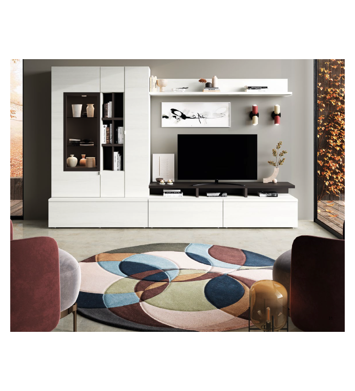 Composición de salón de 300 cm en blanco brillo con vitrina acristalada y detalles en color chocolate. Elegancia contemporánea para tu hogar.