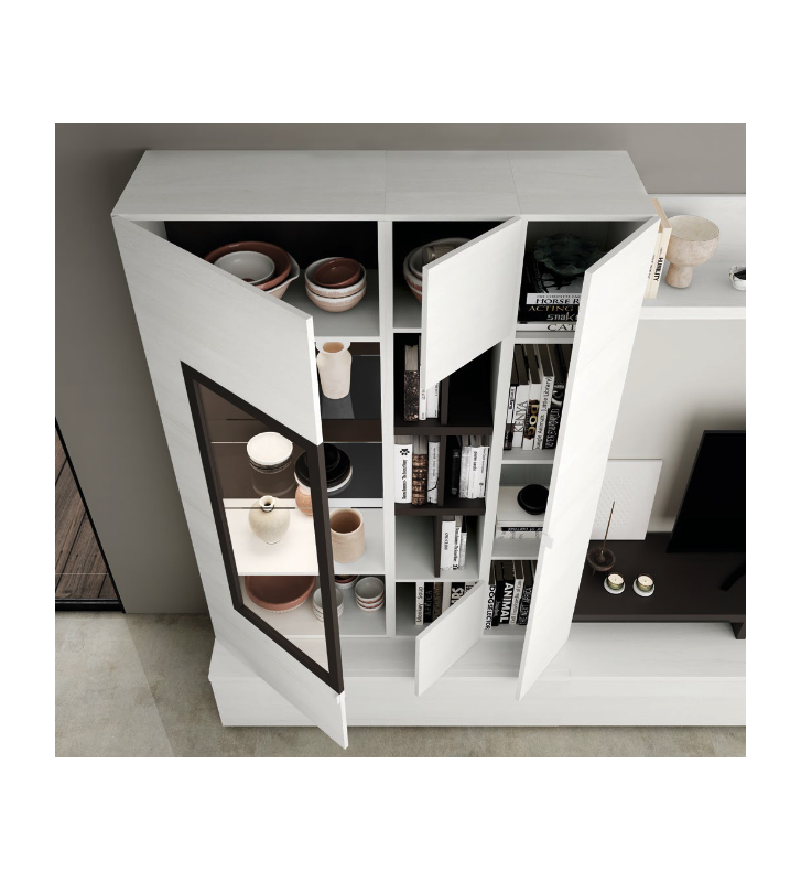 Mueble de salón blanco con vitrina y detalles en contraste chocolate