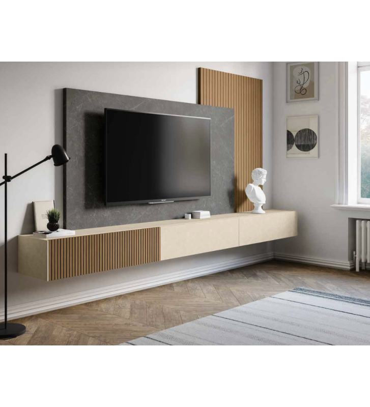 Composición de salón suspendida de diseño contemporáneo que combina panel decorativo con efecto piedra, listones verticales en madera natural y módulo bajo flotante de líneas puras.