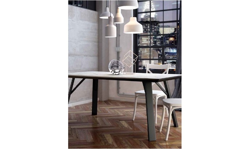 Diseño de líneas rectas de estilo sencillo y con un toque de elegancia. Esta composición está compuesta por la mesa de comedor Woods extensible con patas color Canela y tapa de 1cm de espesor en color Stone. La zona de comedor se completa con las sillas Normann tapizadas en color Gris Oscuro