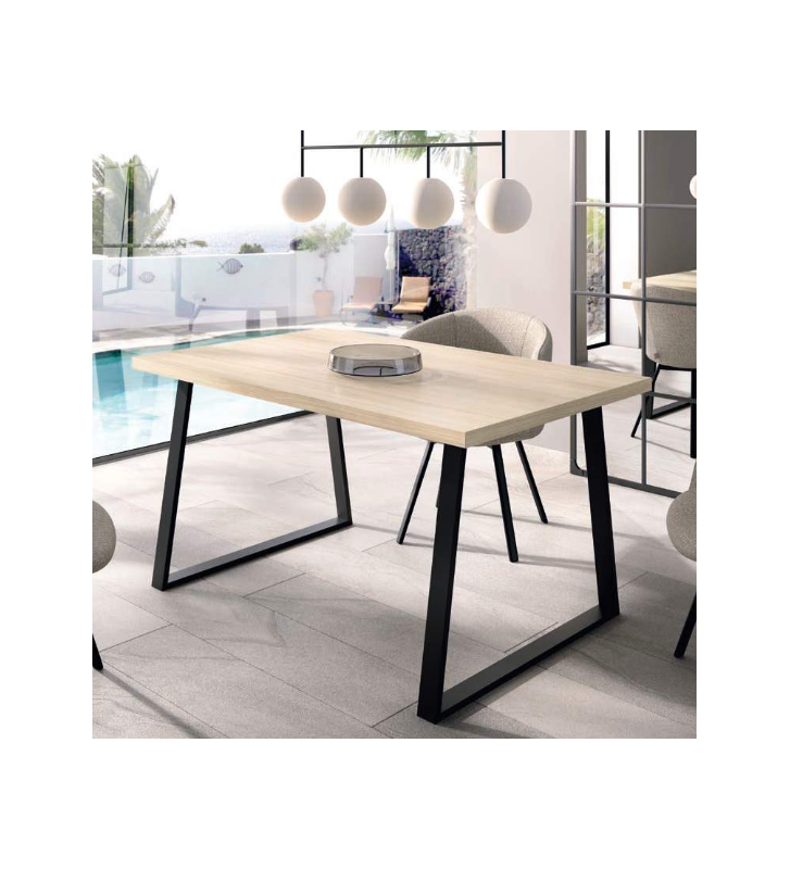 Mesa de comedor moderna con tapa en acabado madera natural y patas metálicas en forma de trapecio.