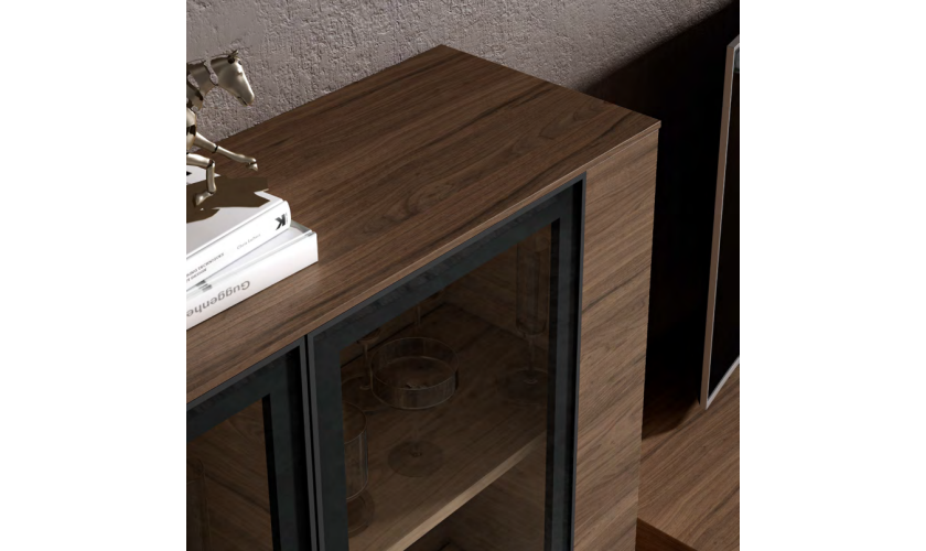 Composicion con módulos vitrina mixtos. La luz led indirecta de los estantes de la vitrina aporta calidez, elegancia y modernidad al entorno. Colores Nómada y Petrol.