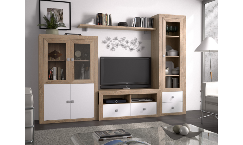 Moderna composición con módulos bajos en Indigo, con vitrina Smoke y