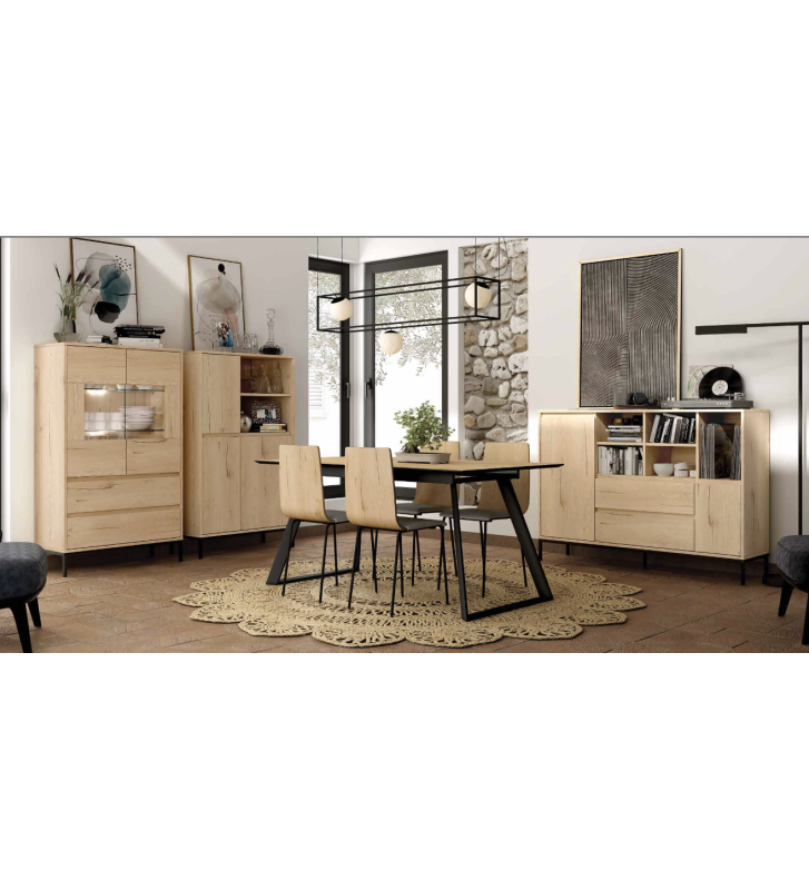 Crea un espacio acogedor, moderno y lleno de personalidad con esta composición de comedor, pensada para hogares donde el diseño y la funcionalidad se encuentran. Fabricado en madera clara con patas metálicas negras, este conjunto combina perfectamente con estilos escandinavos, naturales o industriales.