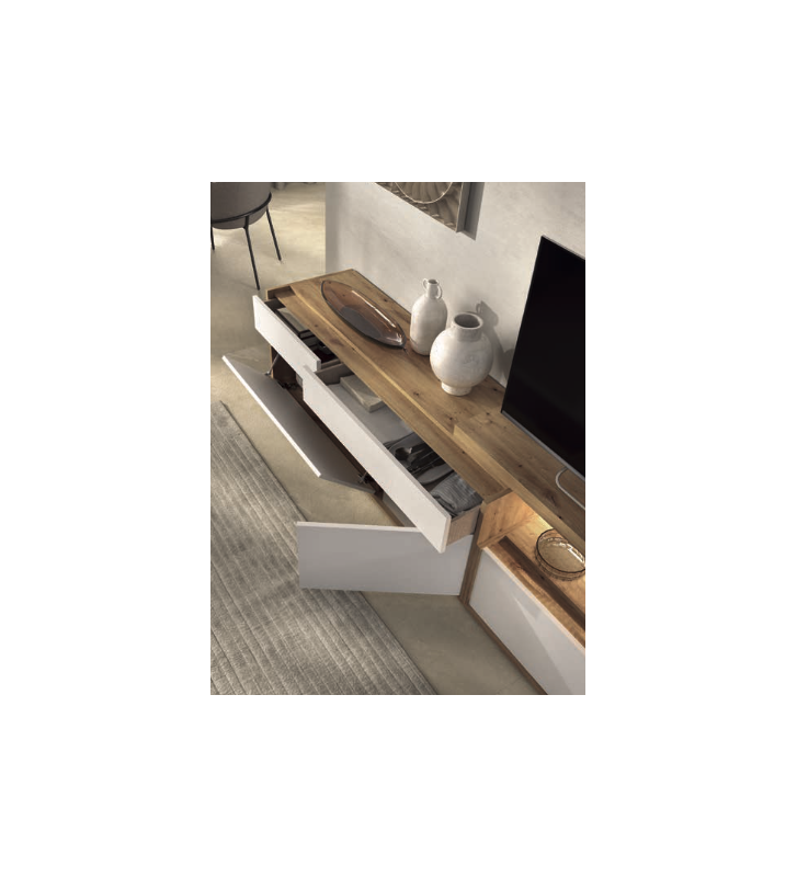 El módulo derecho incluye una zona abierta con iluminación LED incorporada que realza objetos decorativos y crea una atmósfera acogedora en el salón. Ambos módulos cuentan con gran capacidad de almacenaje gracias a sus cajones y puertas abatibles con sistema de apertura sin tiradores (push o uñero, según configuración).