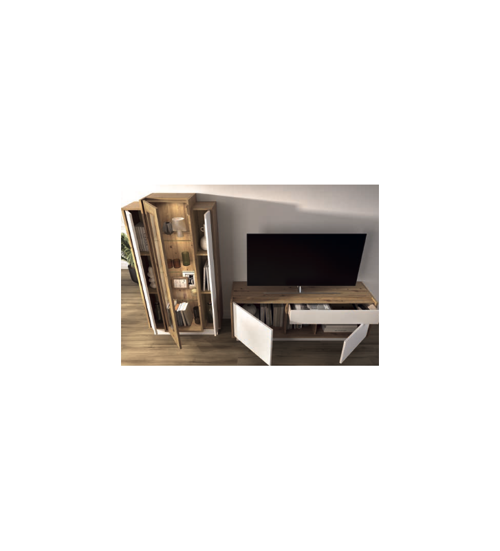 Conjunto moderno de salón compuesto por vitrina con iluminación LED y mueble para TV. Diseño elegante en acabado blanco mate y roble natural. Ideal para salones contemporáneos.