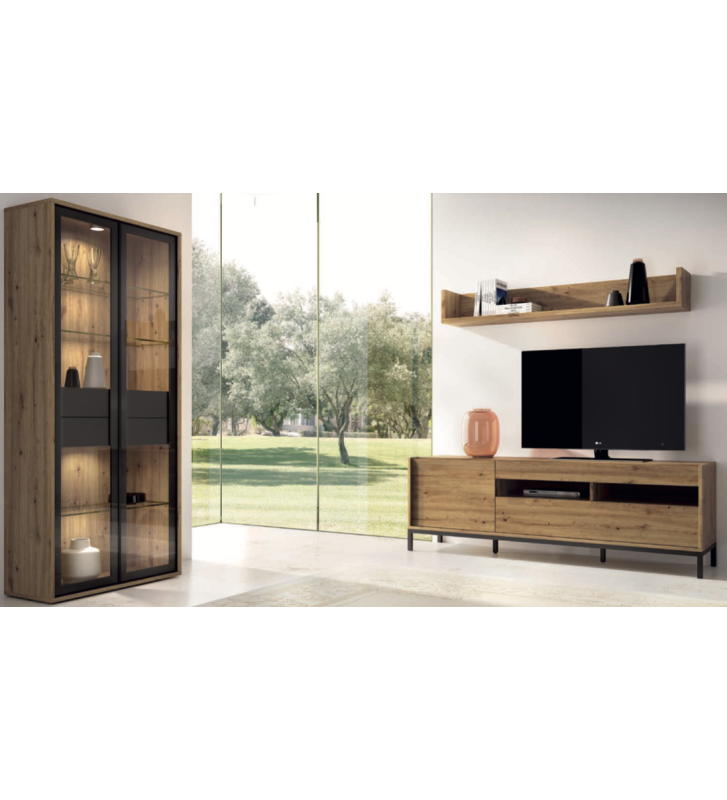 Este conjunto de salón ofrece una combinación perfecta entre estética industrial y funcionalidad contemporánea. La vitrina alta, con puertas de cristal y estructura metálica negra, incorpora iluminación interior LED para realzar tus objetos más especiales. Su diseño vertical maximiza el almacenaje sin recargar el espacio.