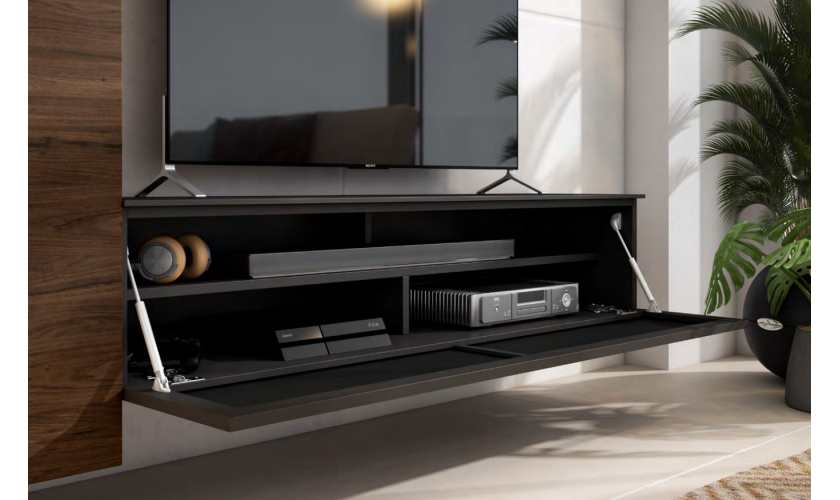 La composición que integra a la perfección el modulo Sound en tela acústica antracita. El lugar ideal para tu barra de sonido, y todos los demás dispositivos electrónicos tan necesarios en la vida de hoy en día.