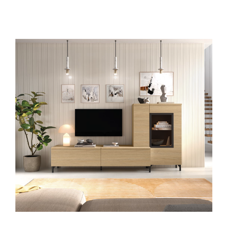 Este mueble de salón combina la elegancia de la madera clara con un diseño contemporáneo de líneas limpias y patas metálicas negras que aportan ligereza visual y estilo industrial suave. Incluye un módulo bajo para TV, un módulo lateral con vitrina acristalada integrada y base elevada, ideal para exponer piezas decorativas o vajilla. Su disposición modular y estética neutra lo convierten en una opción versátil para cualquier tipo de hogar.