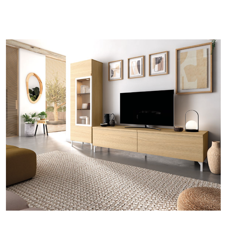 Este mueble de salón moderno en roble natural destaca por su diseño equilibrado, pensado para crear ambientes luminosos, cálidos y atemporales. La composición se articula en torno a un bajo para televisión de gran capacidad, ideal para organizar dispositivos y almacenamiento oculto, acompañado de una vitrina vertical con estantes vistos, perfecta para piezas decorativas o vajilla seleccionada.