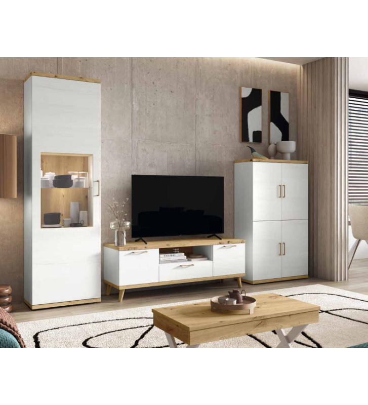 Mueble de salón con vitrina, aparador y módulo TV en blanco y madera