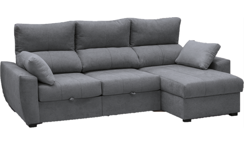 Sofá de 2 plazas con chaise longue en Palma de Mallorca: cabezales reclinables, asientos extraíbles, armazón de madera de pino, arcón integrado y desenfundable