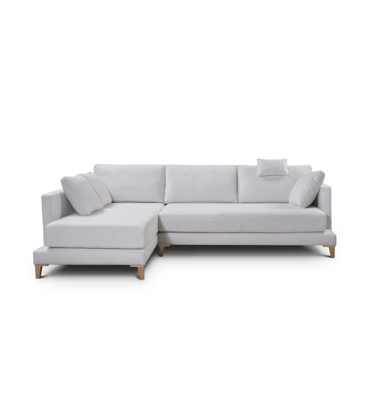 Sofá chaise longue de líneas rectas y diseño contemporáneo, tapizado en tejido neutro de alta calidad y apoyado sobre patas de madera natural.