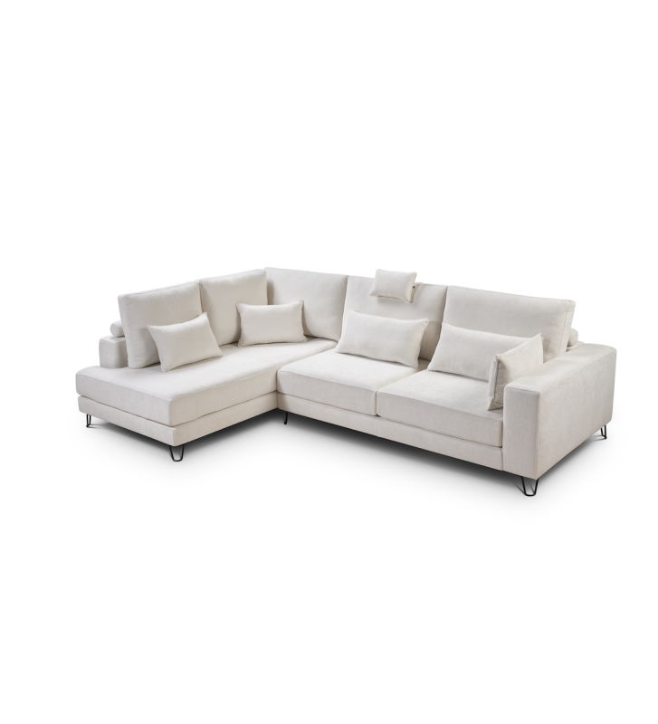 Sofá modular con chaise longue de líneas contemporáneas y diseño equilibrado. Su estética limpia y minimalista, combinada con proporciones amplias y cojines generosos, lo convierten en una pieza ideal para espacios modernos que buscan confort y sofisticación.