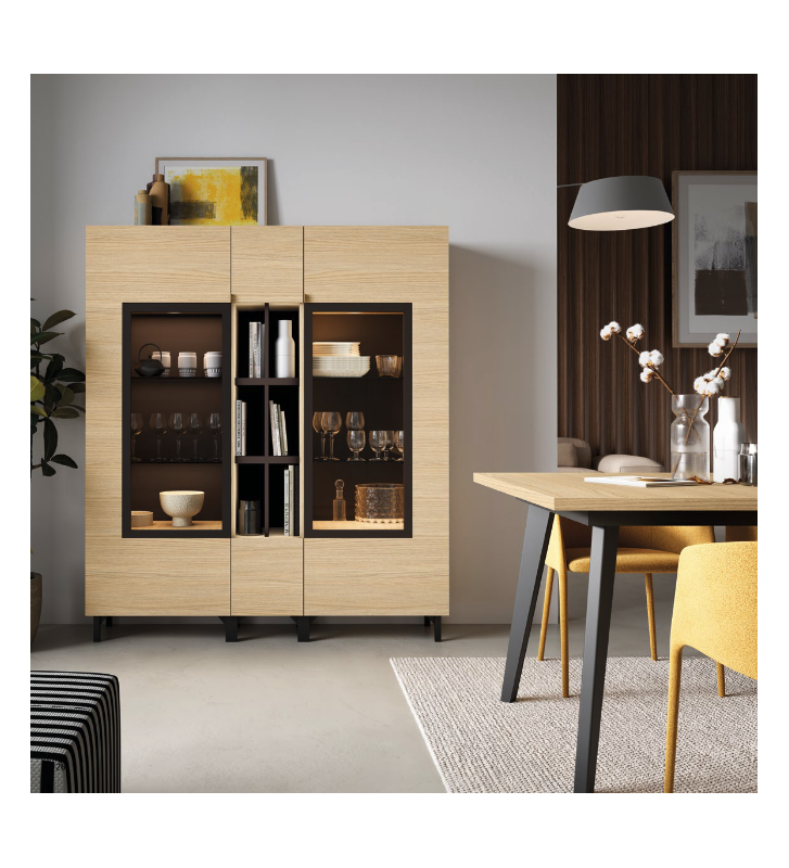 Eleva el diseño de tu comedor o salón con esta vitrina alta de estilo moderno, que combina funcionalidad y elegancia en una misma pieza. Su estructura en acabado roble claro se realza con un marco negro que enmarca las puertas de cristal, ofreciendo un contraste sofisticado y actual.